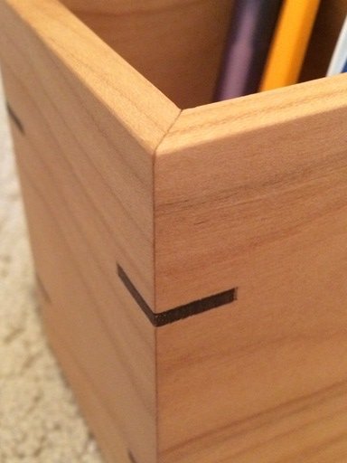I made this pencil holder for my mom last Christmas. It’s made from 3/8 inch thick cherry, with mitered corners and walnut splines.