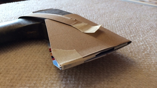 I started by making a template out of cardboard. I knew that I wanted the sheath to fold over the top of the blade, and have a seam at the sharp part. So I took a piece of cardboard, folded it over the top, and cut it to the shape I wanted.
