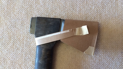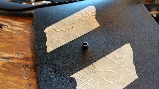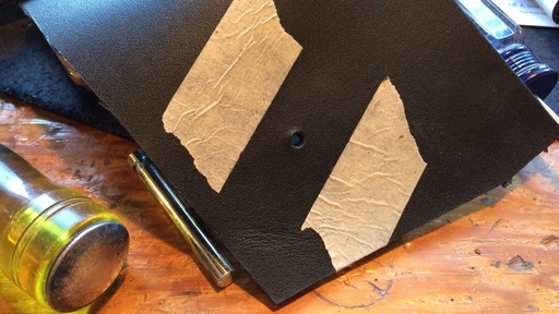 I then clamped the sheath back on the axe, and positioned the strap for the snap. The male end of the snap goes on the sheath itself, with the female part on the strap. I put a piece of masking tape on the sheath, on each side of the strap. I punched a hole between them using a leather punch.