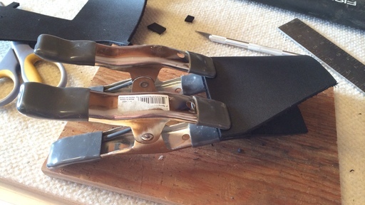 I folded the sheath body over the top of the blade, and clamped it along the edge that would later be sewn, with the spacer in place.