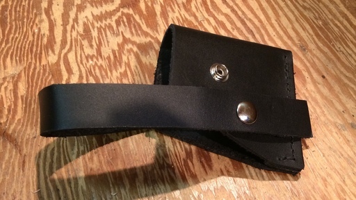 The leather I used came from an 8 oz. Smooth Black Strap Leather Bundle from Leather Unlimited. I bought Easy-To-Do Line 24 Snaps & Setter and Waxed Braided Cord from Tandy Leather. The axe is a Fiskars X27 Super Splitting Axe.