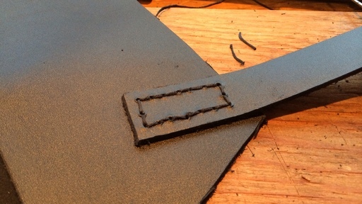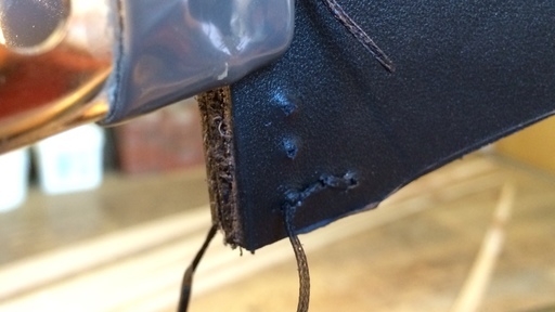 I sewed the strap with a stitch that works like a sewing machine, so a loop of the thread is just pushed through a hole, and a thread on the other side goes through it. This worked okay, but I used a different stitch later. I finished the stitching with square knots on the inside of the sheath—nothing fancy.