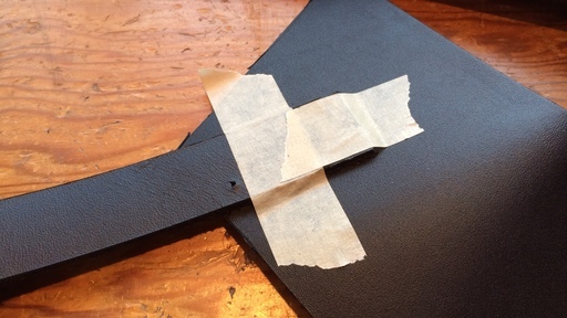 I arranged the strap in a way that would hold the sheath firmly, and taped the back end in place with some masking tape. I removed the clamps holding the sheath together, and flattened it to make it easier to sew.